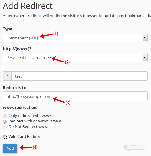 3. Under Add Redirect, you should enter the following details and choose the appropriate options.