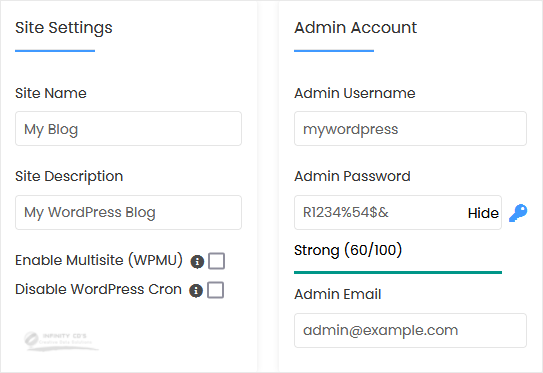 • Admin Username: Your new WordPress username (for security reasons, do not use the administrator or the admin username).