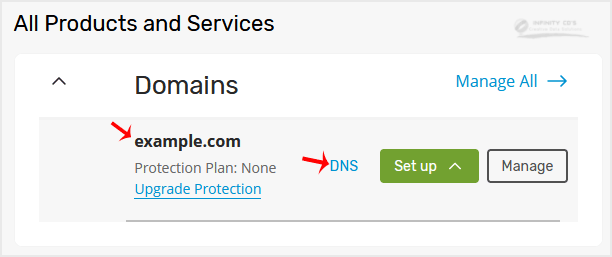 3. Under the Domains section. Click on DNS next to the domain you wish to manage.