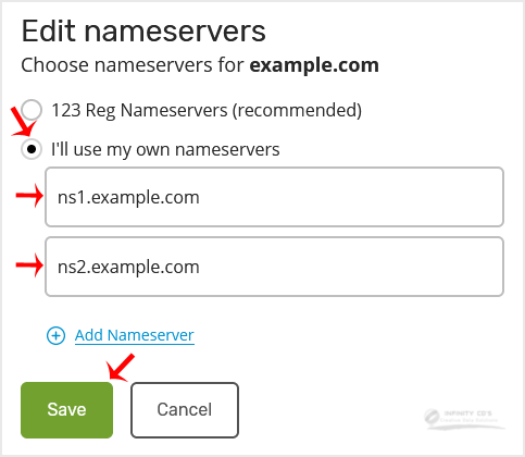 5. Choose the "I'll use my own nameservers" option, and enter your nameservers in the designated fields.