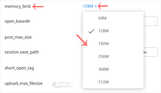 4. Look for memory_limit and click on the drop-down option displayed in front of it. Then choose the appropriate limit as per your requirements.
